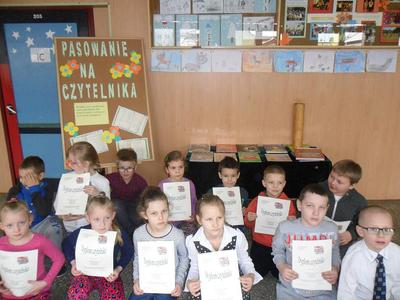 Dnia 1 marca odbyła się uroczystość pasowania pierwszoklasistów na czytelników. Okolicznościowy program artystyczny przygotowały cztery klasy pierwsze. Po prezentacji uczniowie złożyli uroczystą przysięgę i zostali pasowani na czytelników przez szkolnego bibliotekarza panią Świerczyńską. Dla upamiętnienia tego wydarzenia pani dyrektor Tadajewska wręczyła każdemu dziecku dyplom czytelnika.