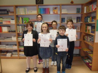 21 kwietnia zostały rozegrane, we wszystkich województwach, półfinały konkursu „Wielka Liga Czytelników”. Naszą szkołę reprezentowała drużyna uczniów z klas 1-3 (Maciek Lipiński, Natalka Tarka, Zosia Lewandowska) i drużyna z klas 4-6 (Hania Szwedkowicz, Janek Balewski i Martyna Maciejewska). Do finału awansuje po 15 drużyn z całej Polski, które uzyskają15 najlepszych wyników z testu półfinałowego na obydwu poziomach (kl. 1-3 i 4-6). Każdy uczestnik półfinału otrzymał dyplom i pamiątkową zakładkę do książki a szkolna biblioteka pozyskała 4 woluminy wydawnictwa Zakamarki.