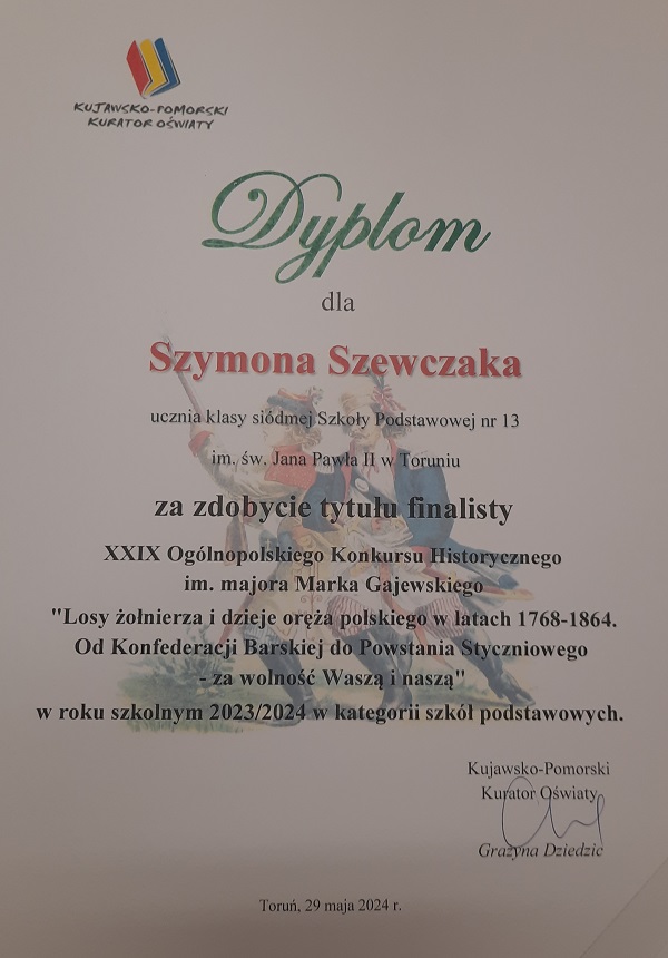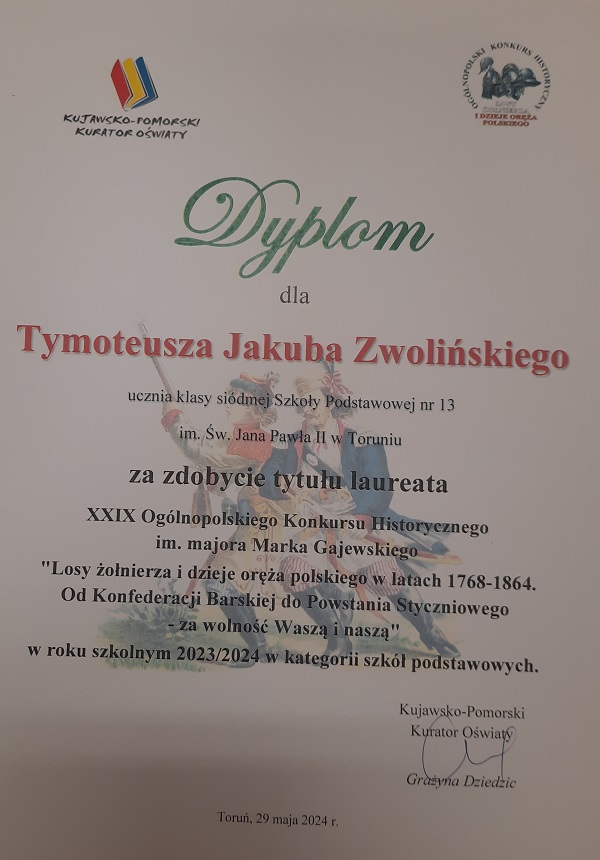 Tymoteusz Zwoliński - uczeń naszej szkoły został laureatem XXIX edycji Ogólnopolskiego Konkursu Historycznego im. majora Marka Gajewskiego „Losy żołnierza i dzieje oręża polskiego w latach 1768-1864. Od konfederacji barskiej do powstania styczniowego. Za naszą i waszą wolność.”