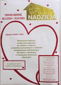 ZBIÓRKA NA HOSPICJUM Nasza szkoła organizuje zbiórkę darów dla toruńskiego hospicjum „Nadzieja”. Rzeczy można zostawiać przy portierni do 13.12.2024r. . Nie bądźmy obojętni na prośbę o pomoc hospicjum. Galeria zdjęć Powiązane wiadomości Ogólnopolska lekcja online z udziałem Ministra... KONKURS INFORMATYCZNY 11 listopada – Narodowe Święto Niepodległości ZBIÓRKA NA HOSPICJUM SZKOLNY MIKOŁAJKOWY TURNIEJ SZACHOWY Świąteczny Kiermasz Książek Drukuj Udostępnij Data dodania: 30.11.2024 Wyświetlono: 139 Aktualności