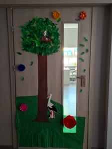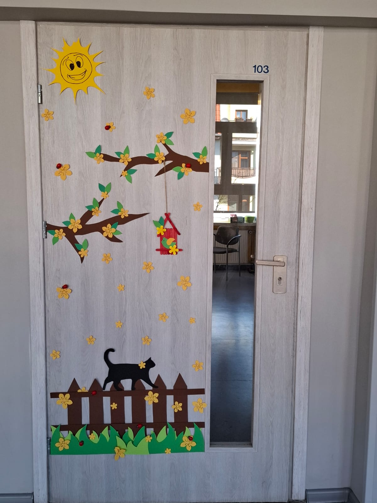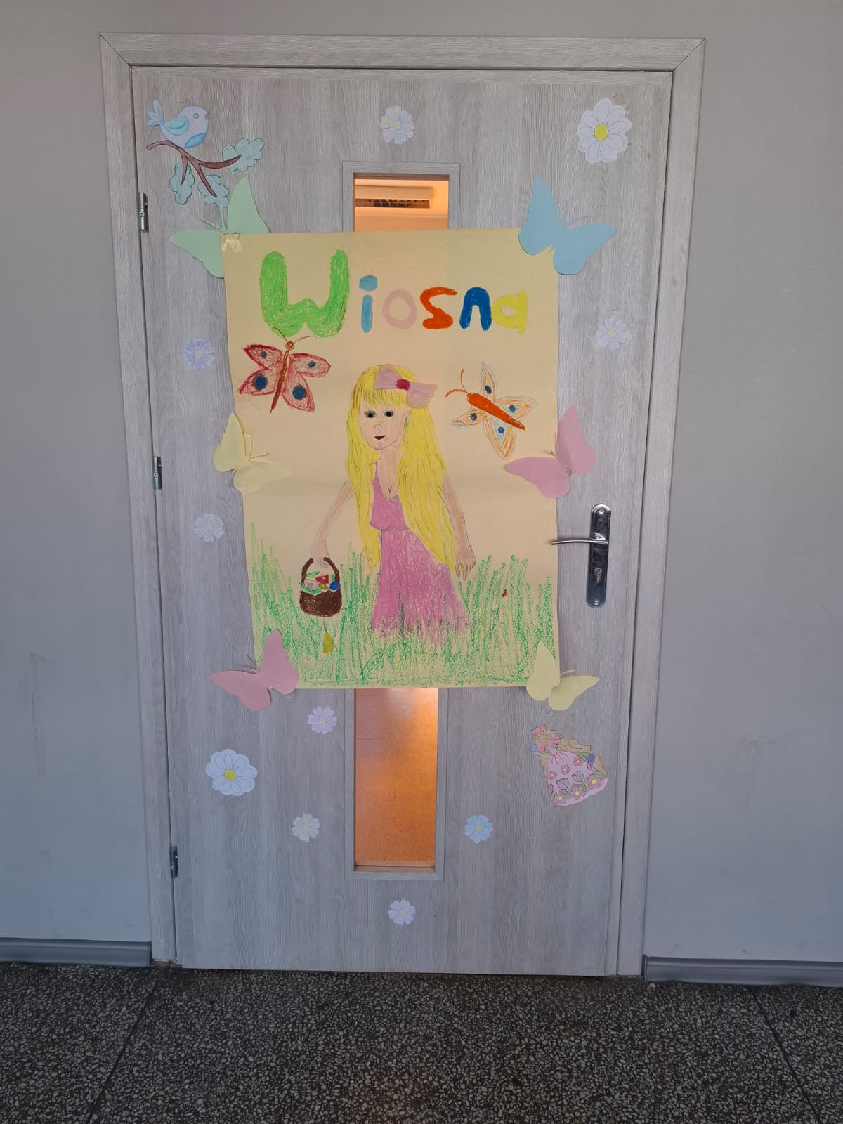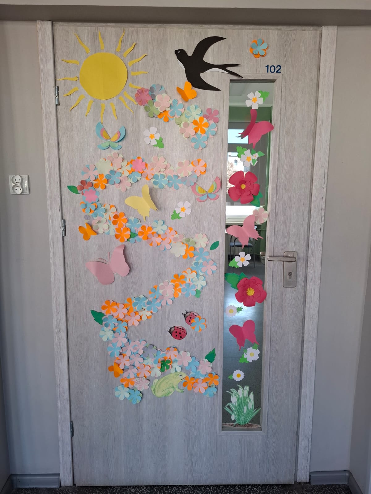 Wszystkie klasy 4 – 8, aby zaznaczyć nadejście wiosny, ozdobiły drzwi swoich sal lekcyjnych na pierwszym piętrze. Zrobiło się kolorowo i radośnie. Tego dnia nikt nie myślał o szkolnych obowiązkach – liczyła się dobra zabawa , rozmowy, integracja i cieszenie się pierwszymi promieniami wiosennego słońca.
