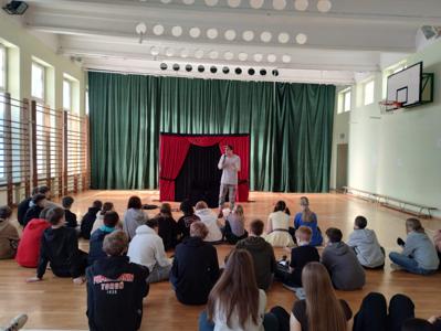 W ubiegłym tygodniu uczniowie klas 7 i 8 wzięli udział w profilaktycznym przedstawieniu teatralnym pt. "Człowiek bez twarzy" tematyka przestawienia dotyczyła agresji, hejtu oraz odrzucenia społecznego.