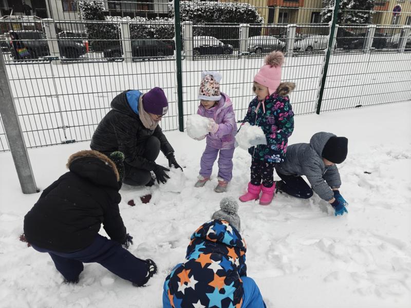 Zabawy przedszkolaków na śniegu i pierwszy Bałwan "Sówek"